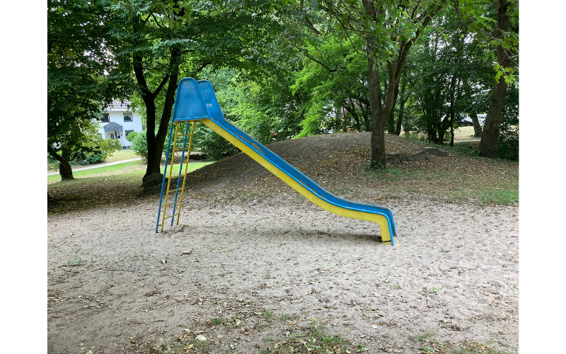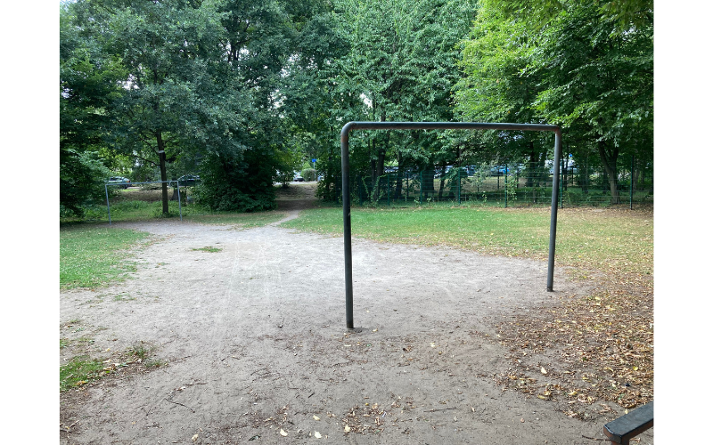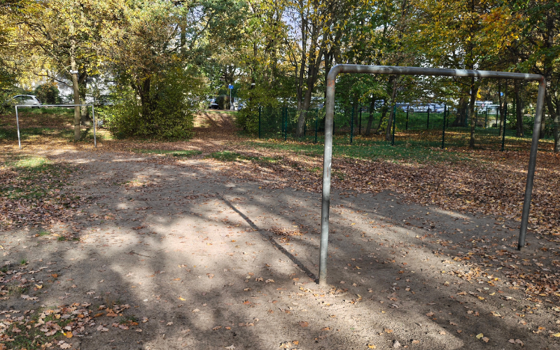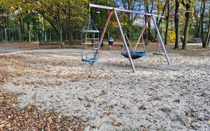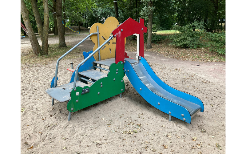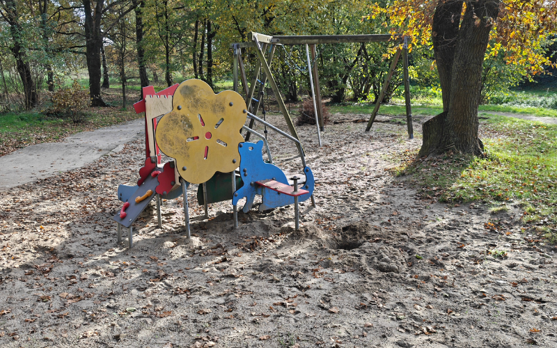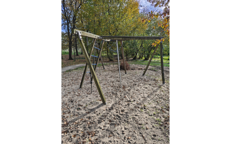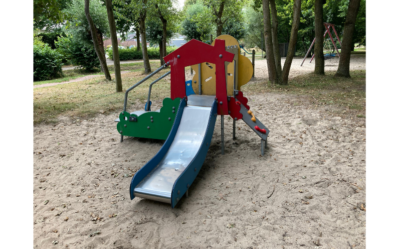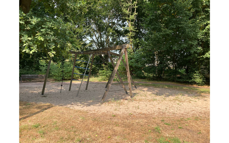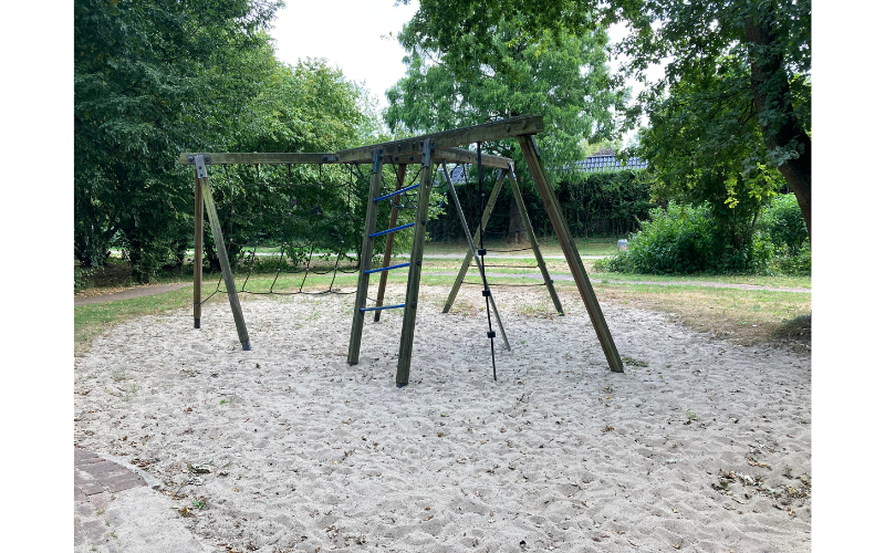Vorhandene Spielgeräte: Kleinkind-Klettergerüst mit Rutsche, Bockrutsche, Schaukelkombination mit Vogelnest, Rund- und Käfigschaukel, Klettergerüst ohne Rutsche, Podestgerüst mit Kleinkindschaukel