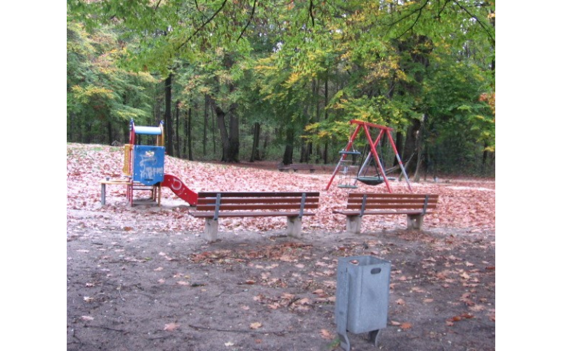 Vorhandene Spielgeräte: Bolzfläche mit zwei Toren, Vogelnestschaukel, Reifenschaukel, Tampenschaukel, Klettergerüst mit Rutsche, Kleinkindklettergerüst, Natur mit Spielwert, Hügel zum Rennen & Klettern, Pavillion mit Sitzgelegenheiten, Tischtennisplatte, Steinfigur, Reckstangen