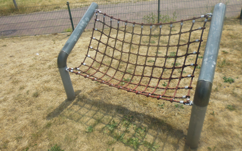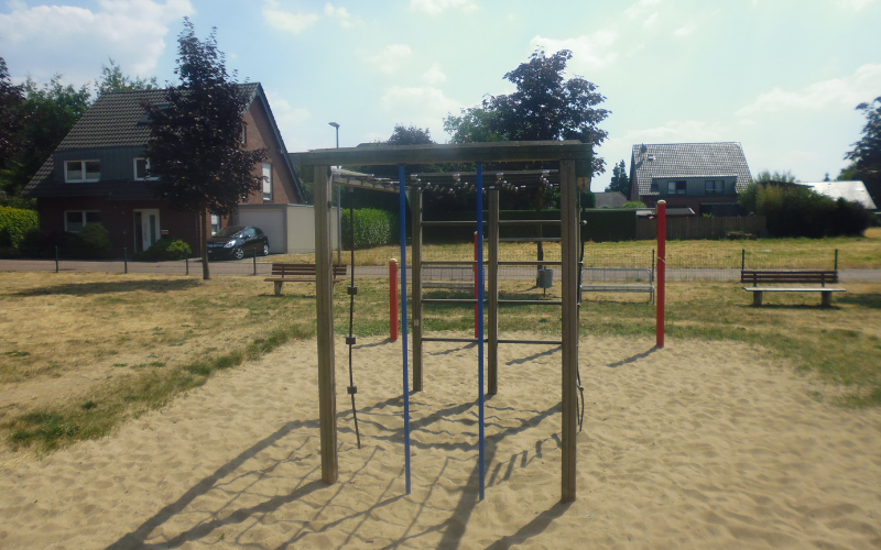 Vorhandene Spielgeräte: Reckstangen, Seilelemente, Vogelnestschaukel, Drehelement, Einzelpersonwippe, Mehrpersonenwippe, Tischtennisplatte, Kletterelement